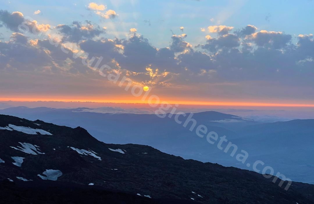 Lassen Sie sich vom Sonnenuntergang an den Gipfelkratern des Ätna verzaubern: ein unvergessliches Erlebnis, bei dem die warmen Farben des Himmels mit der Mondlandschaft des Vulkans verschmelzen und spektakuläre Panoramen und Empfindungen schenken, die im Herzen bleiben werden.
