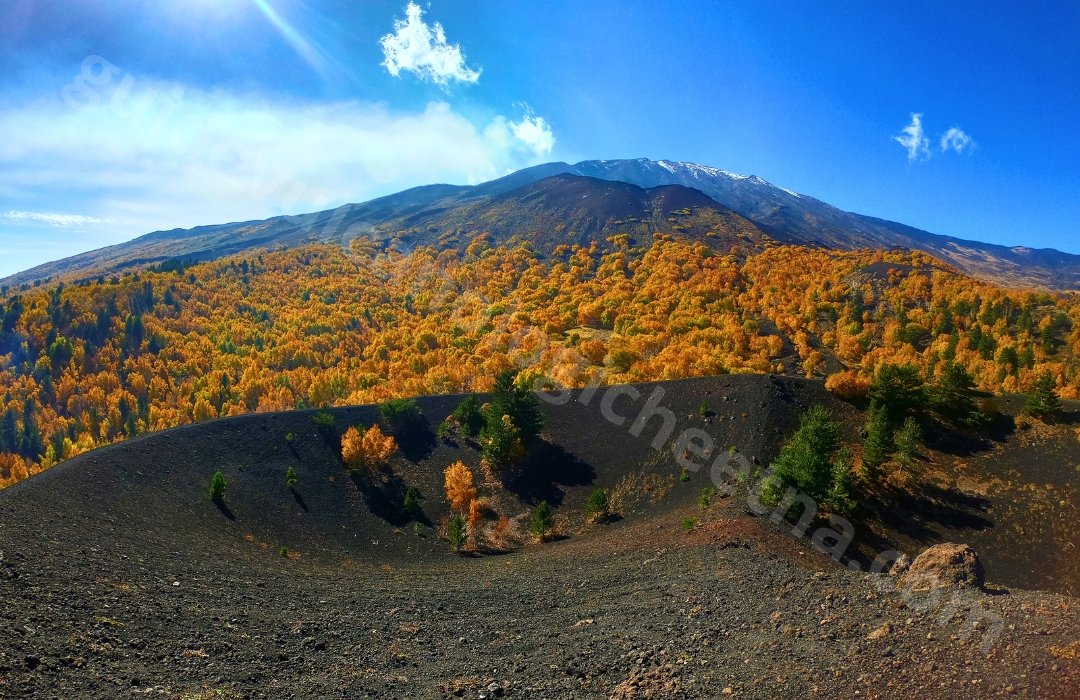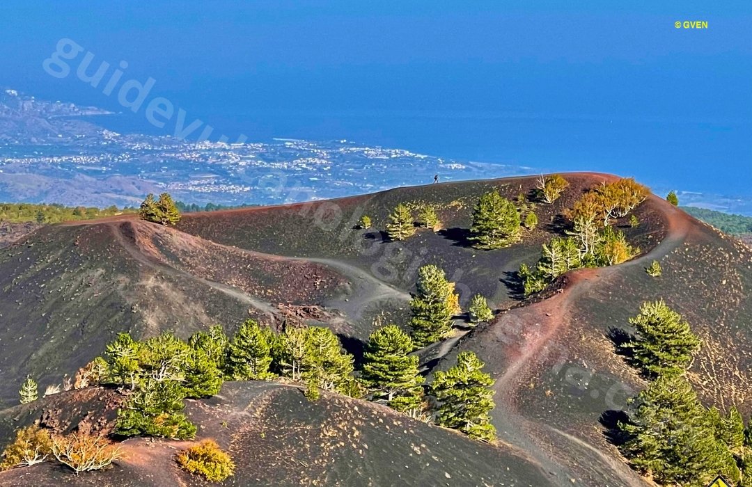 Au sommet des cratères, le panorama s’ouvre sur des cratères dits en “bottonnière”, car alignés en une ligne parfaite. De là, on peut admirer la pinède de Linguaglossa, l’immense étendue de lave solidifiée et la côte ionienne, avec une vue sur la Calabre et le détroit de Messine. Derrière vous, se dresse le majestueux Mont Frumento delle Concazze, un cône adventif de l’Etna, ajoutant une touche spectaculaire au paysage.