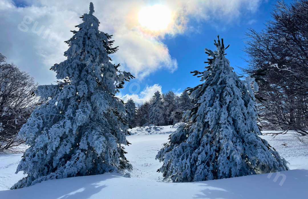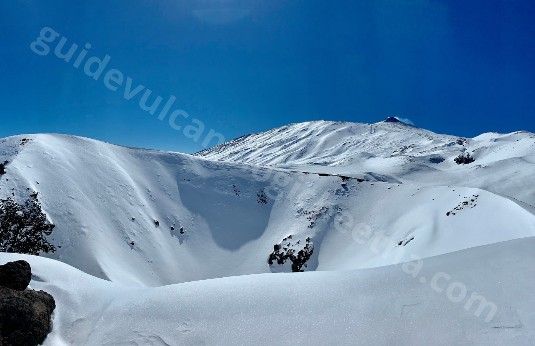 L’excursion commence à Piano Provenzana (1800 m), sur le versant nord de l’Etna, en traversant des bois enneigés et d’anciennes coulées de lave. Après une brève introduction, nous empruntons un sentier enneigé qui nous mène vers les Cratères de 2002.