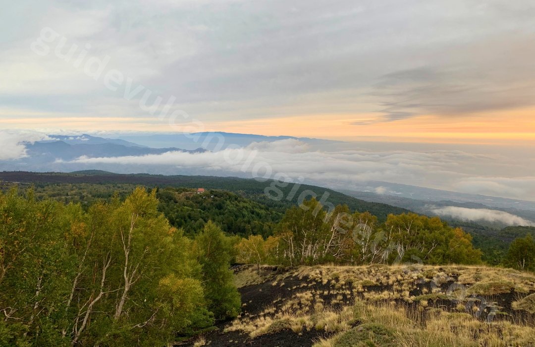 L’excursion commence sur l’esplanade en face du refuge Citelli, à une altitude de 1740 mètres. Le sentier débute à travers une magnifique forêt composée d’espèces végétales uniques, telles que le bouleau de l’Etna (Betula aetnesis – espèce endémique de l’Etna). La végétation est ponctuellement interrompue par des canaux creusés par les eaux de fonte des neiges.